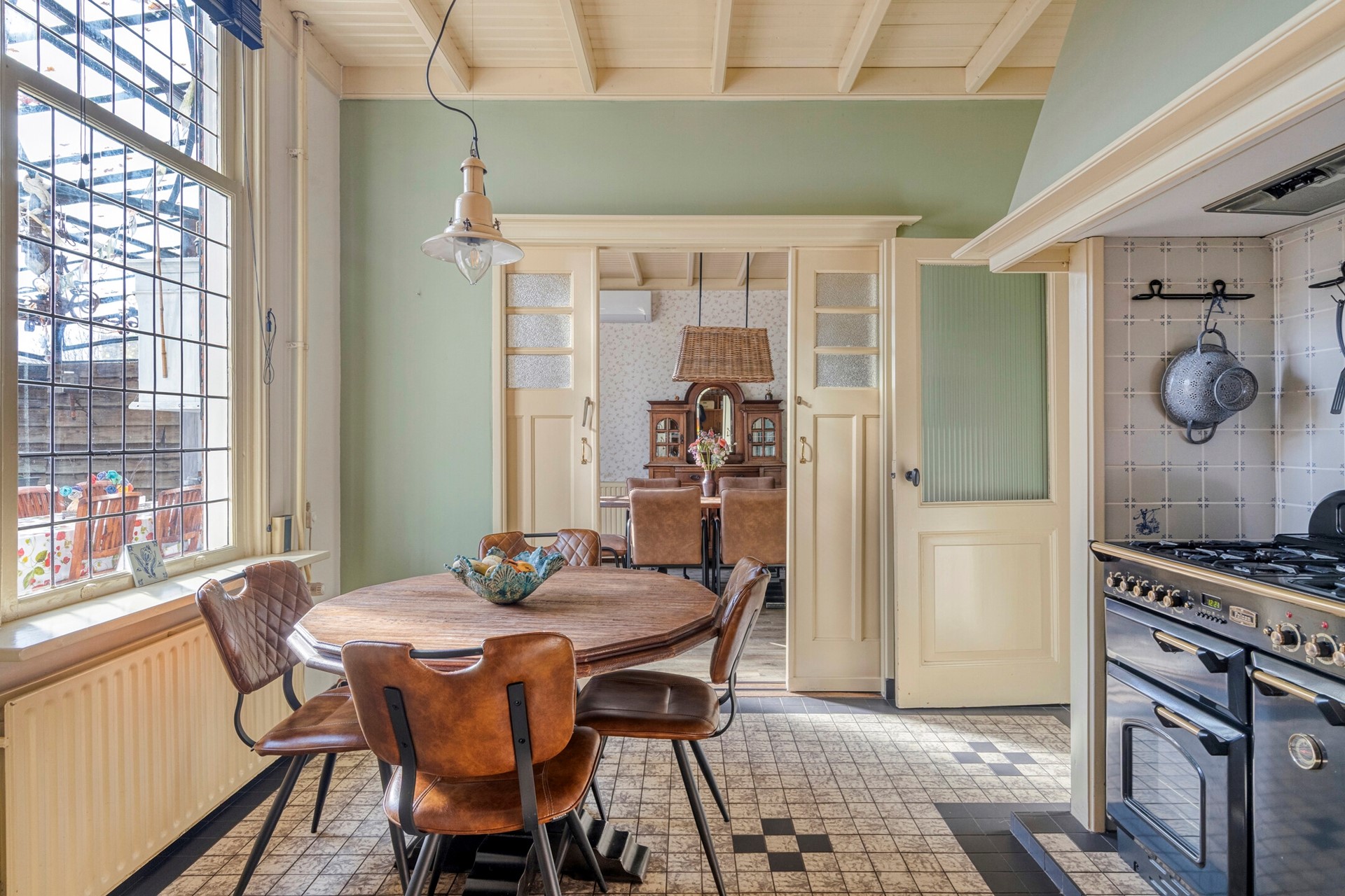 De keuken bevindt zich aan de achterzijde en vormt het hart van het huis. Deze landelijke keuken is voorzien van een Falcon-fornuis met oven, geplaatst in een karakteristieke schouw, een granieten werkblad, en volop kast- en werkruimte. Authentieke details zoals glas-in-loodramen, tegelwerk en ensuite schuifdeuren versterken de nostalgische sfeer.