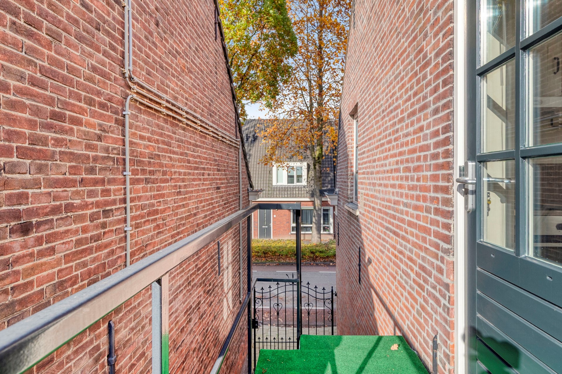 De fraai aangelegde tuin is een oase van rust midden in het centrum. Direct aan de woning bevindt zich een prachtige handgesmede ijzeren veranda met houten vlonder-vloer en elektrisch zonnescherm — een heerlijke plek om het hele jaar door te genieten van het buitenleven. Dankzij de dubbele openslaande deuren vanuit de woonkamer vloeien binnen en buiten hier naadloos in elkaar over.