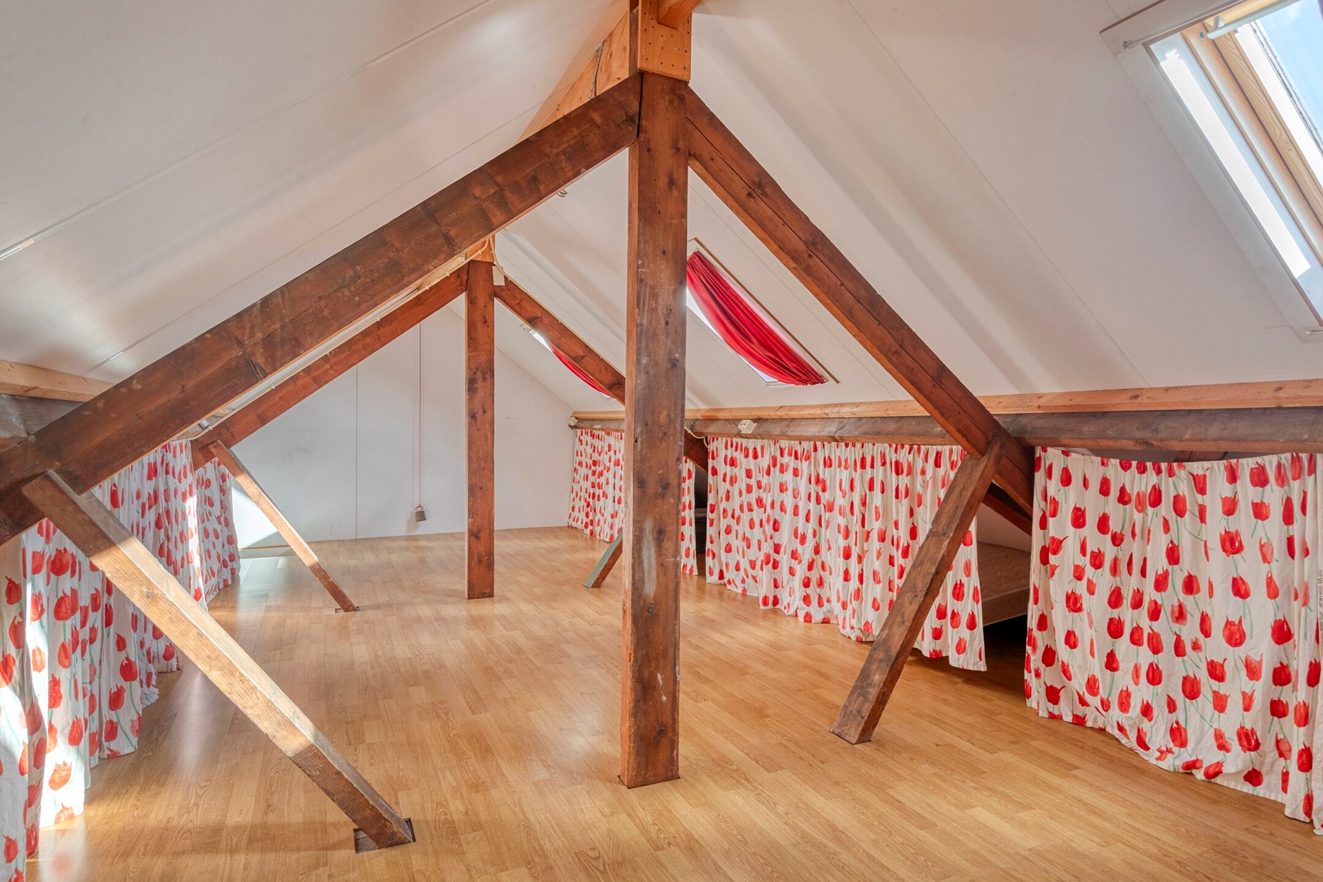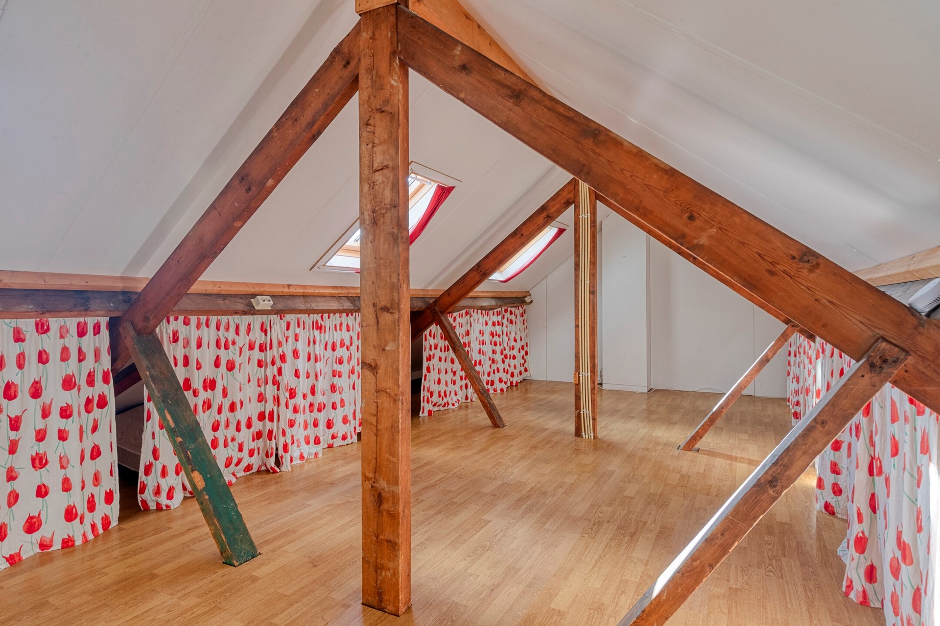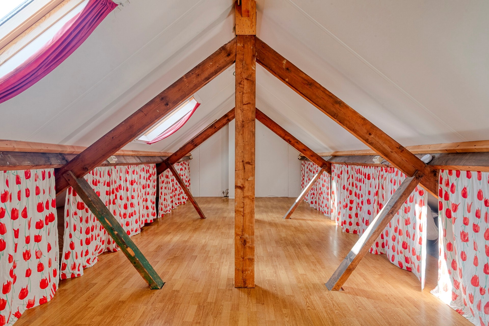 De ruime, open zolder met drie dakramen biedt veel bergruimte en mogelijkheden voor een extra slaapkamer.