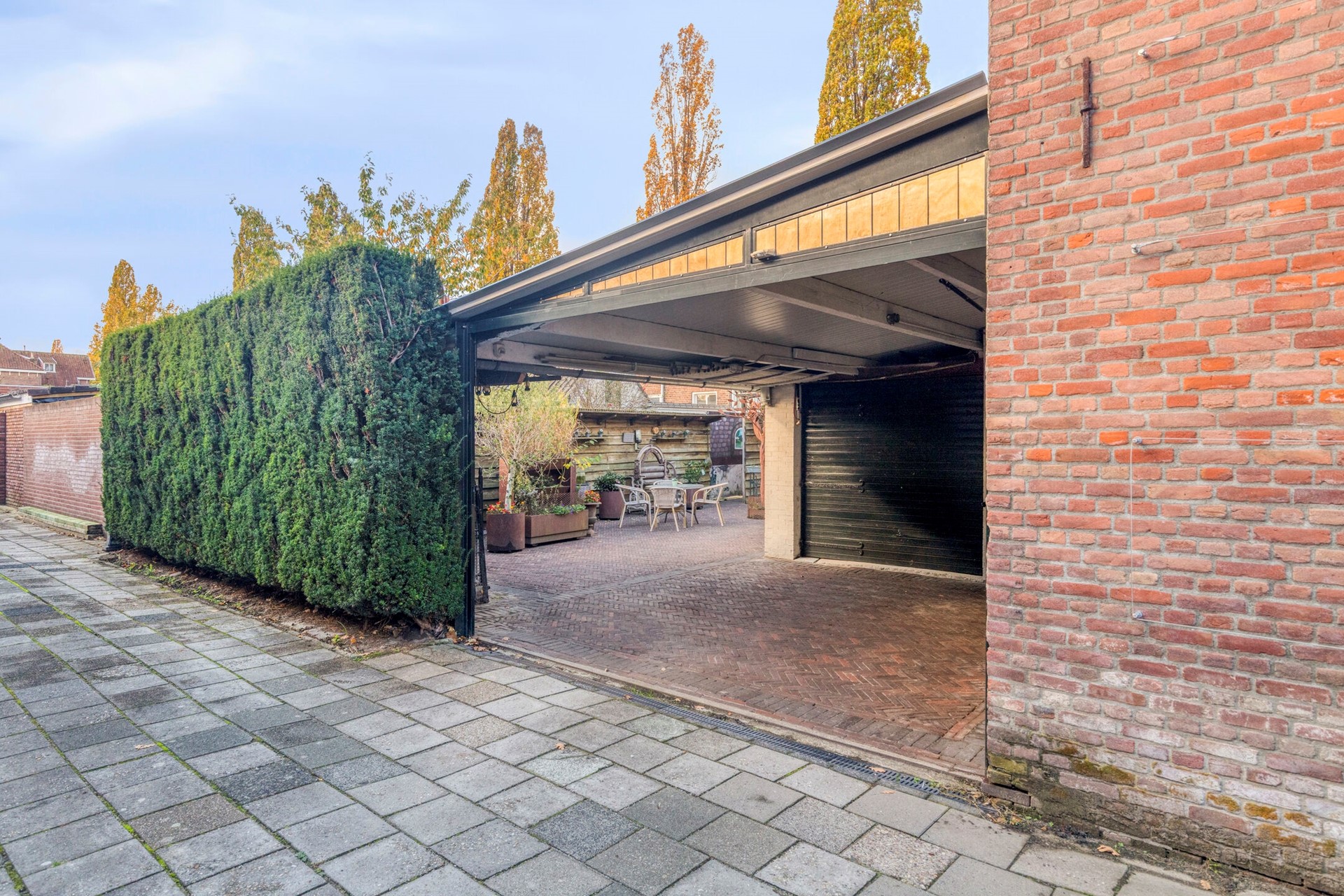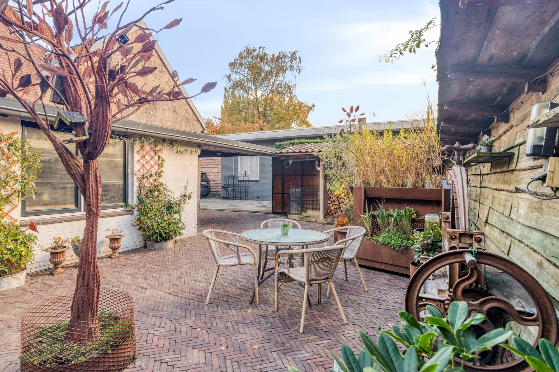 Verder is de tuin onderhoudsvriendelijk aangelegd met gebakken klinkers, diverse overkappingen en een sierlijke boom die zorgt voor een sfeervolle uitstraling. Via de zij-ingang is er een achterom en aan de achterzijde bevindt zich een grote schuifpoort naar de carport met parkeergelegenheid en toegang tot de ruime garage (24 m²).
