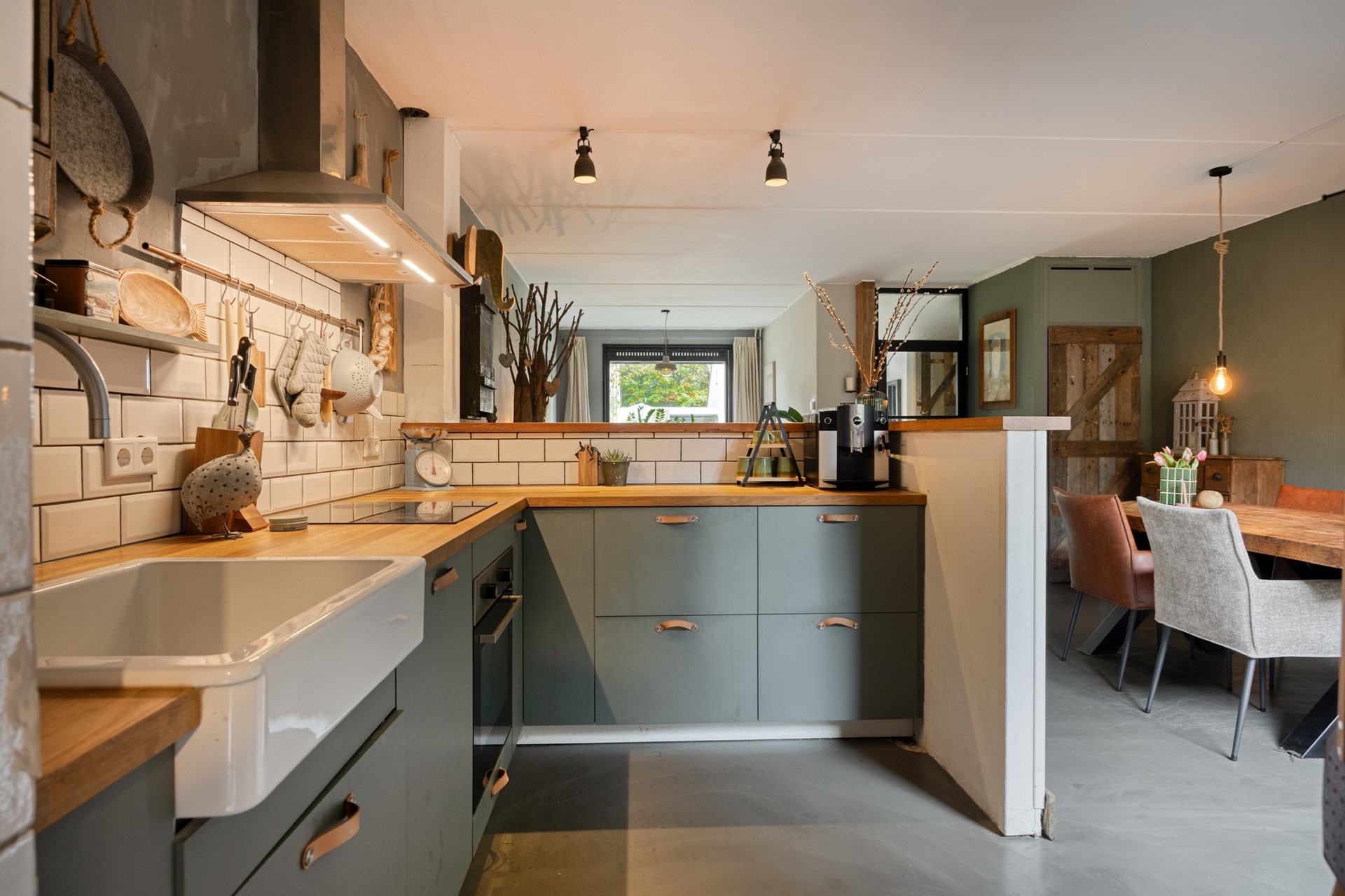 Aan de achterzijde bevindt zich de open hoekkeuken in landelijke stijl, uitgerust met diverse inbouwapparatuur, waaronder een inductiekookplaat, oven, vaatwasser en Quooker. Aansluitend ligt de praktische bijkeuken/berging, met aansluitingen voor wasmachine en droger en extra bergruimte.