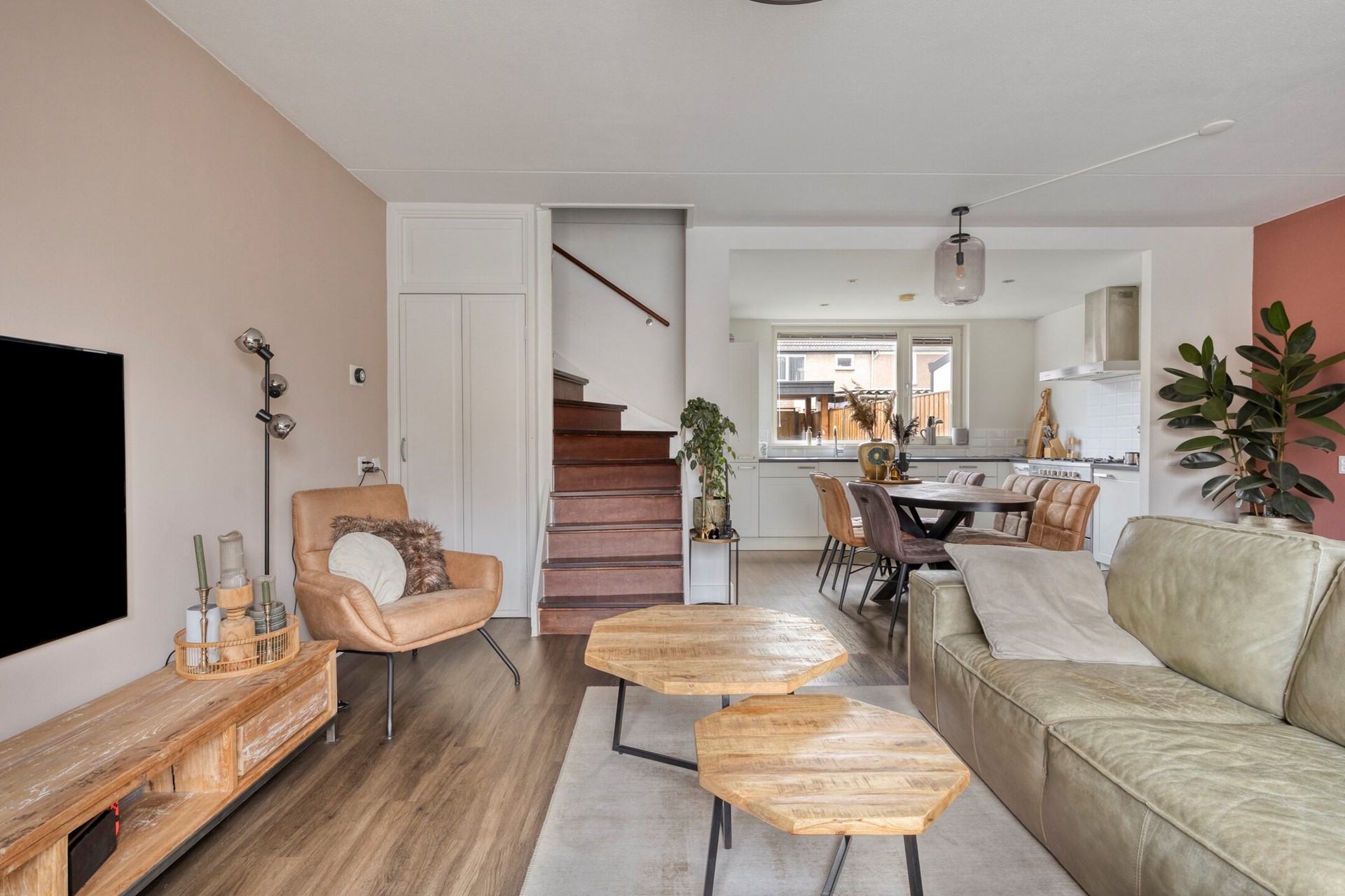 De woonkamer is licht en strak afgewerkt met gestucte wanden en een moderne pvc-vloer. De grote raampartij zorgt voor veel natuurlijke lichtinval en een prettige sfeer. Onder de trap bevindt zich een praktische bergkast.