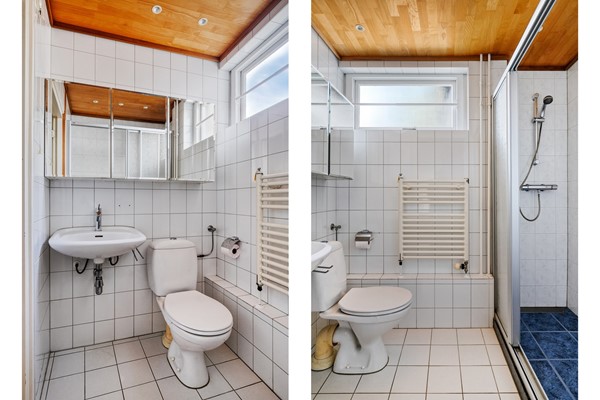 • Eenvoudige badkamer met toilet, douche en wastafel