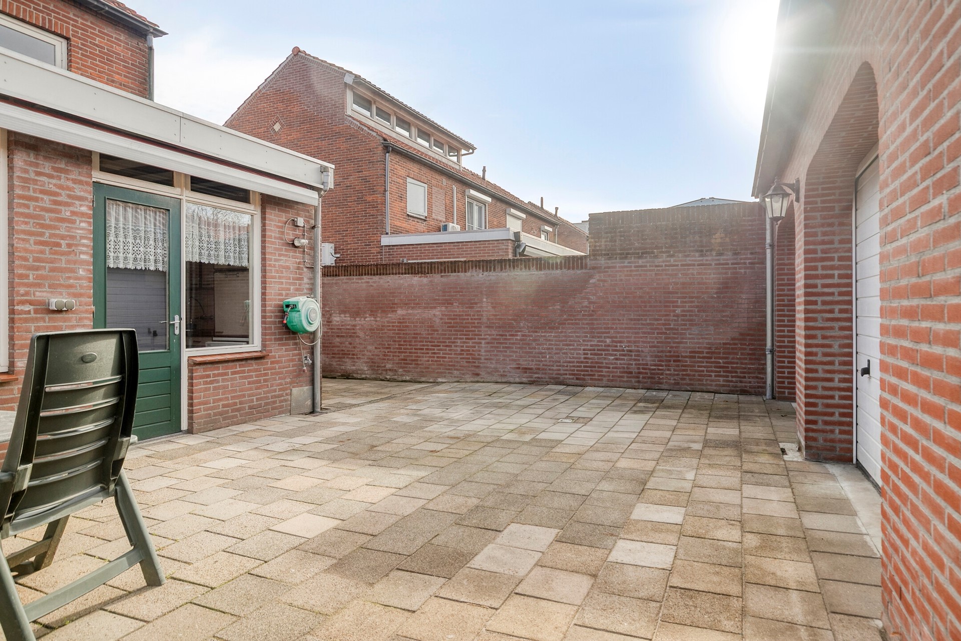 De achtertuin is grotendeels verhard en biedt toegang tot de ruime, in spouw gebouwde dubbele garage, voorzien van twee roldeuren.