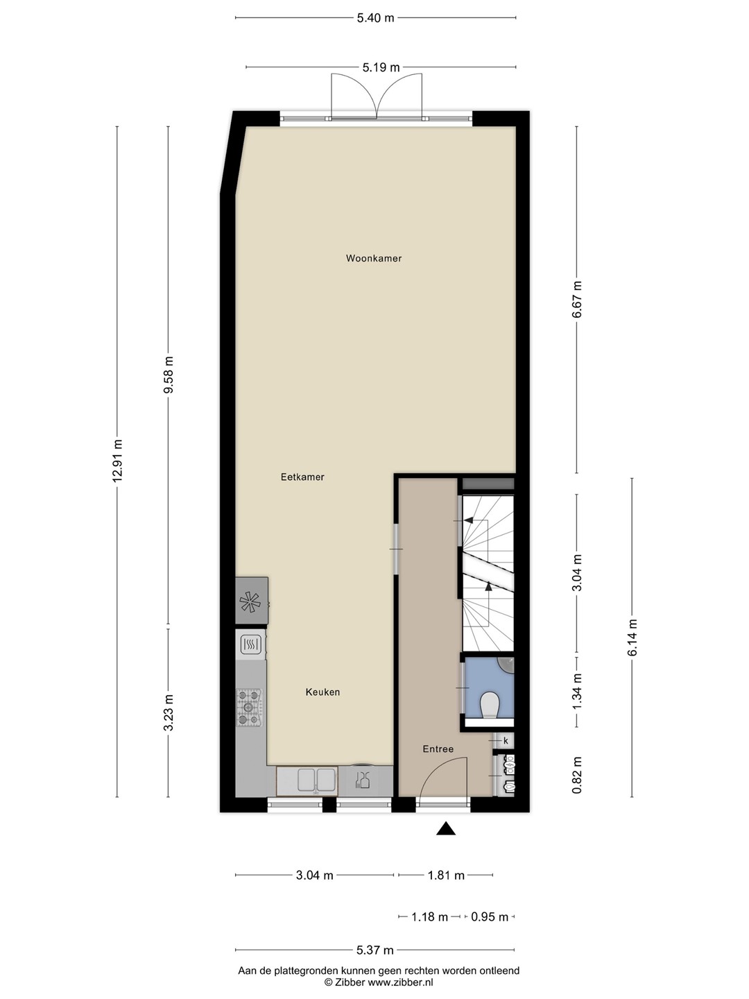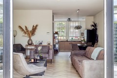 Bij binnenkomst betreedt u de hal met toegang tot de meterkast, toilet, trap naar boven en souterrain, woonkamer en keuken. De lichte woonkamer heeft een grote glazen achterwand met openslaande deuren naar de tuin. De moderne L-vormige keuken is voorzien van een 5-pits gaskookplaat en diverse inbouwapparatuur.