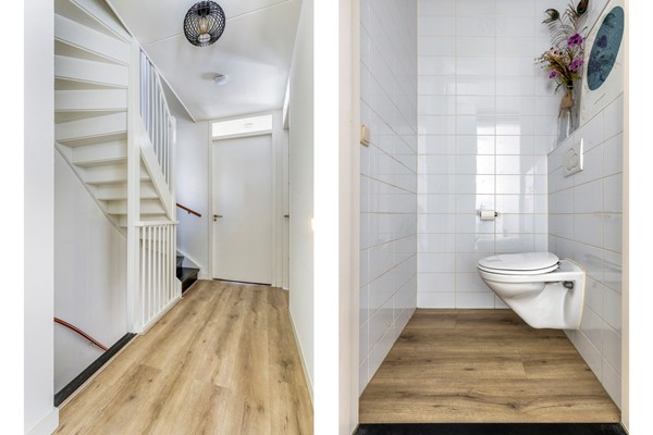 Bij binnenkomst betreedt u de hal met toegang tot de meterkast, toilet, trap naar boven en souterrain, woonkamer en keuken. De lichte woonkamer heeft een grote glazen achterwand met openslaande deuren naar de tuin. De moderne L-vormige keuken is voorzien van een 5-pits gaskookplaat en diverse inbouwapparatuur.