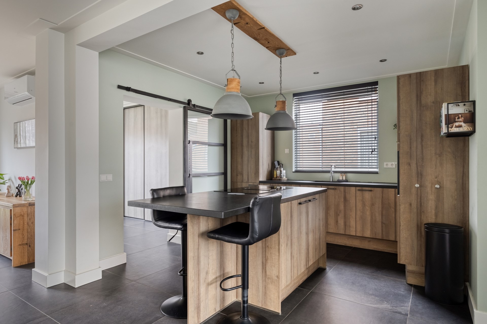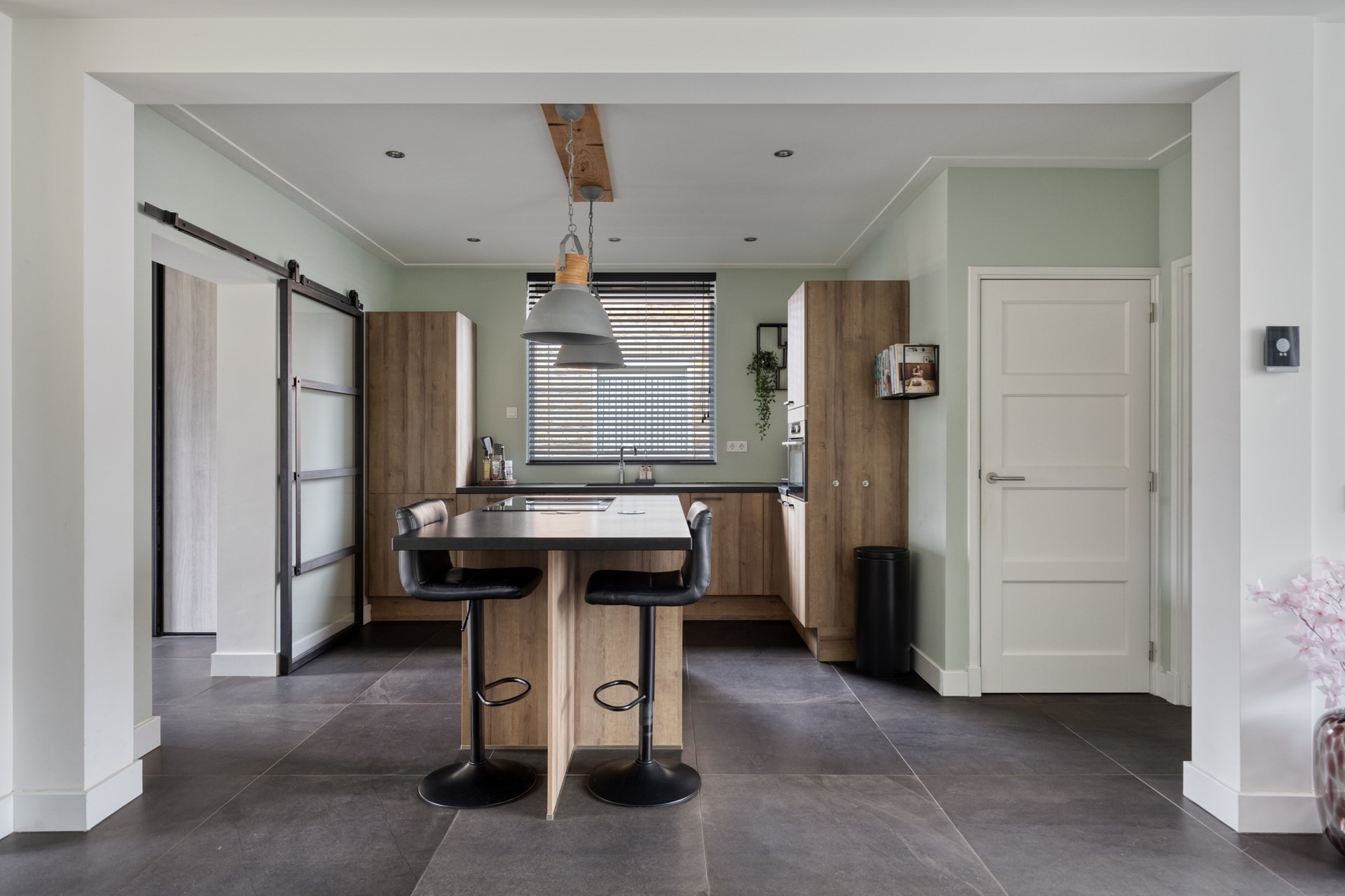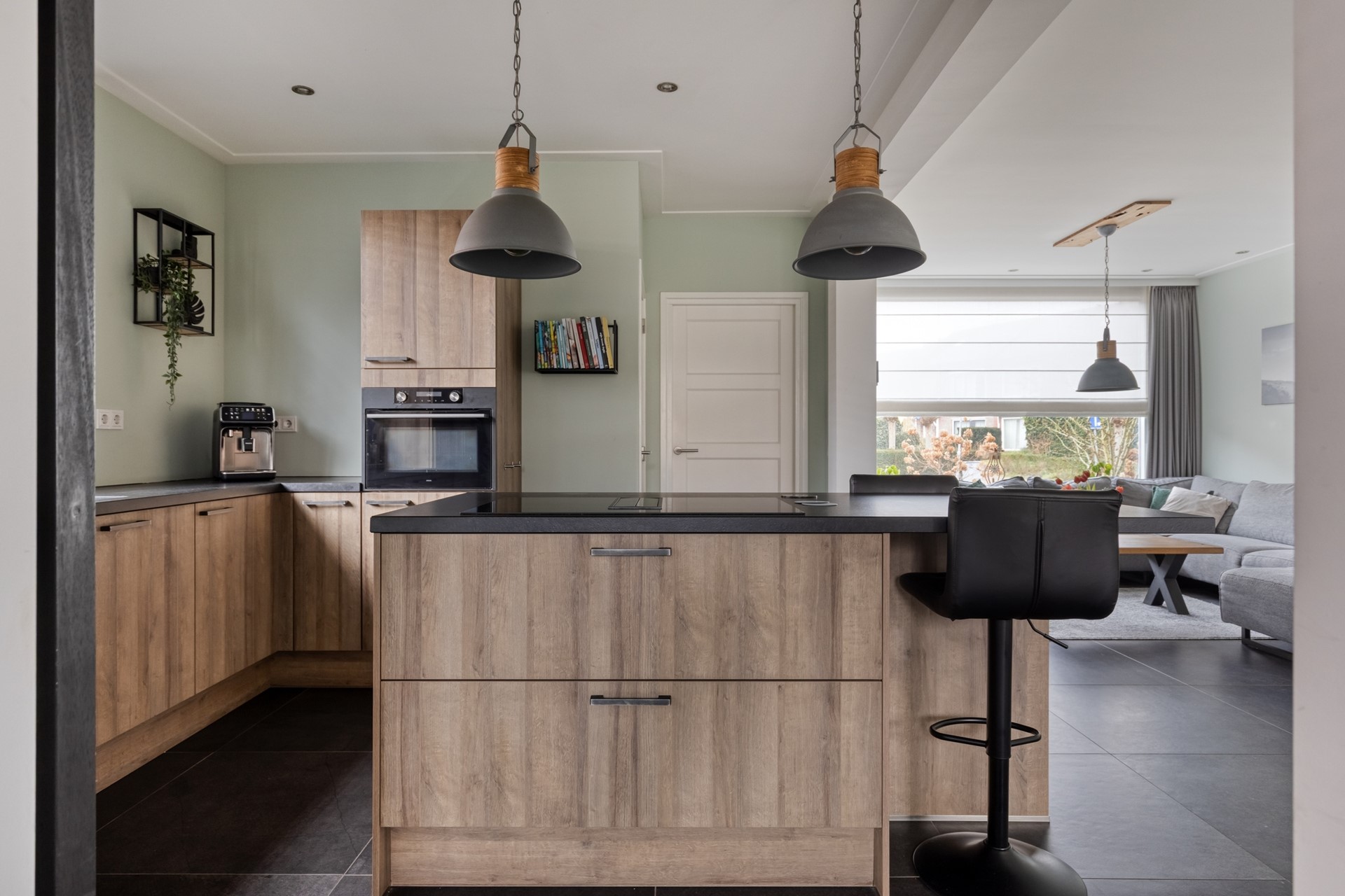 Via de lichte entreehal betreedt u de woning, met toegang tot de keuken, meterkast, toiletruimte en trap naar boven. De moderne houtlook keuken straalt warmte en luxe uit en is compleet uitgerust met een inductiekookplaat met geïntegreerde afzuiging, Quooker, combi oven-magnetron en overige inbouwapparatuur. De stijlvolle paneeldeuren geven de ruimte een chique uitstraling.