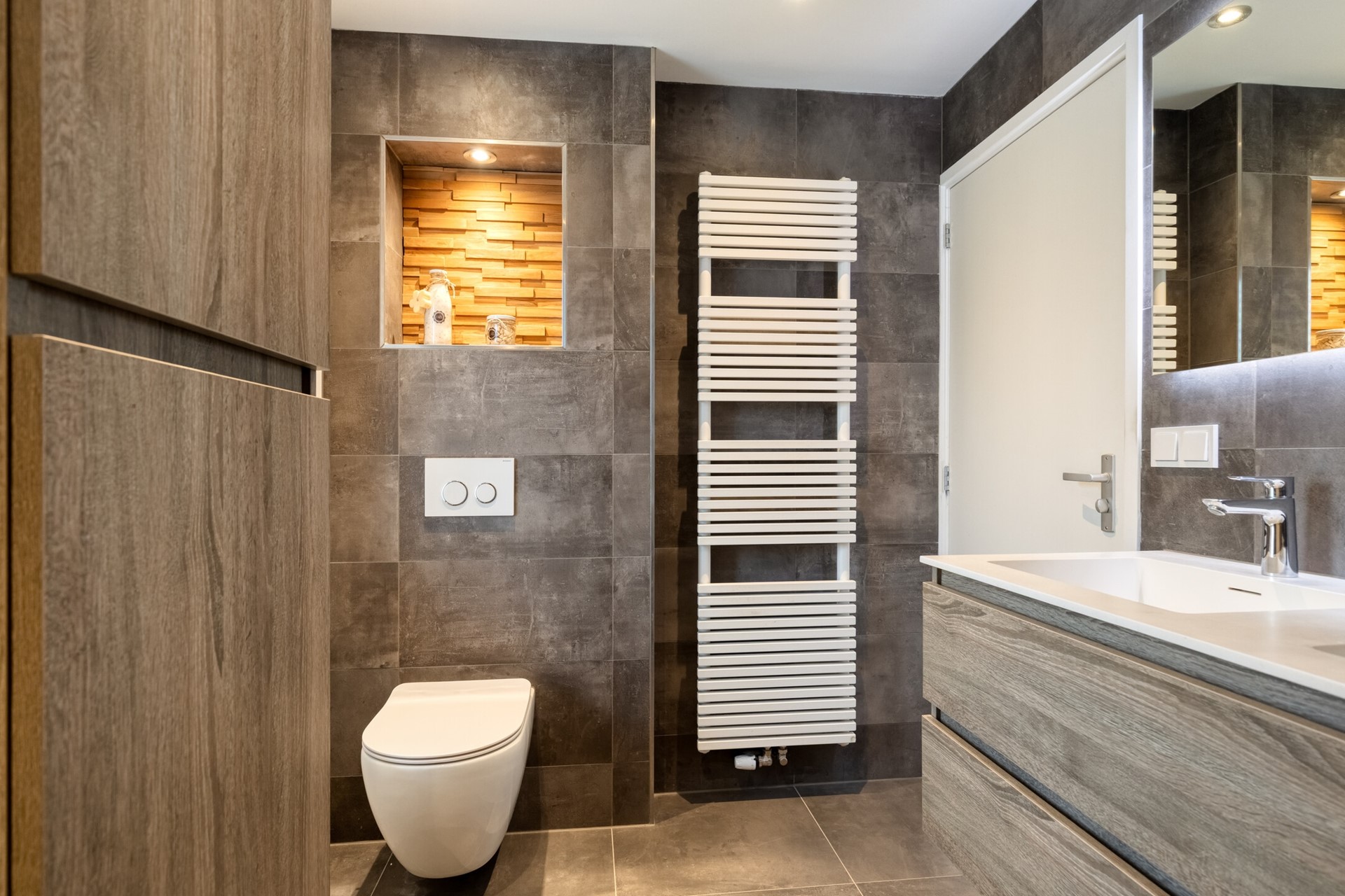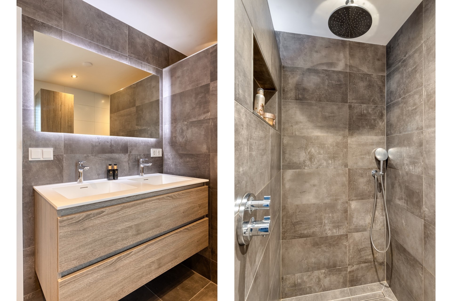 De moderne badkamer is uitgevoerd met een inloopdouche, dubbele wastafel en toilet.