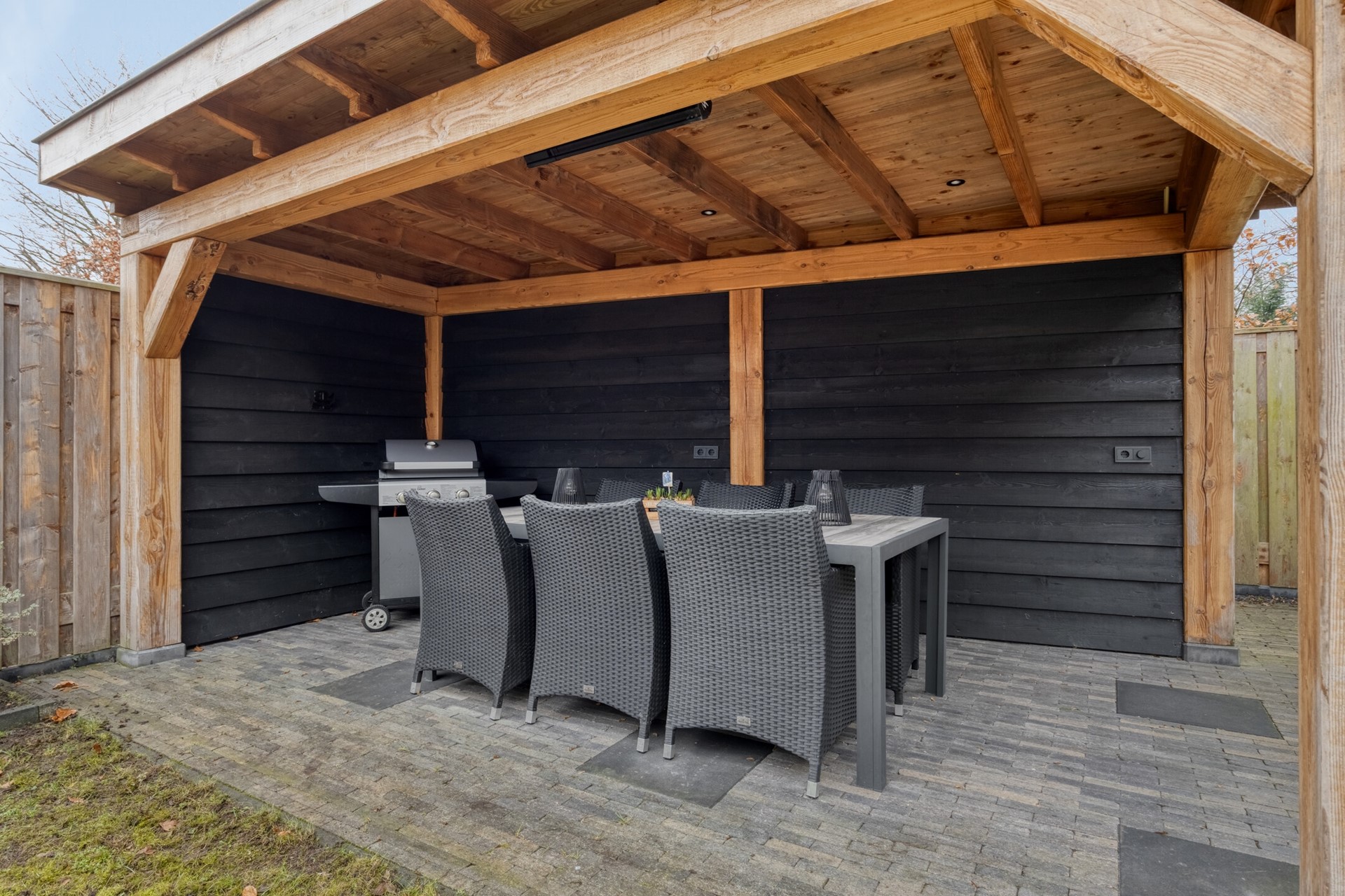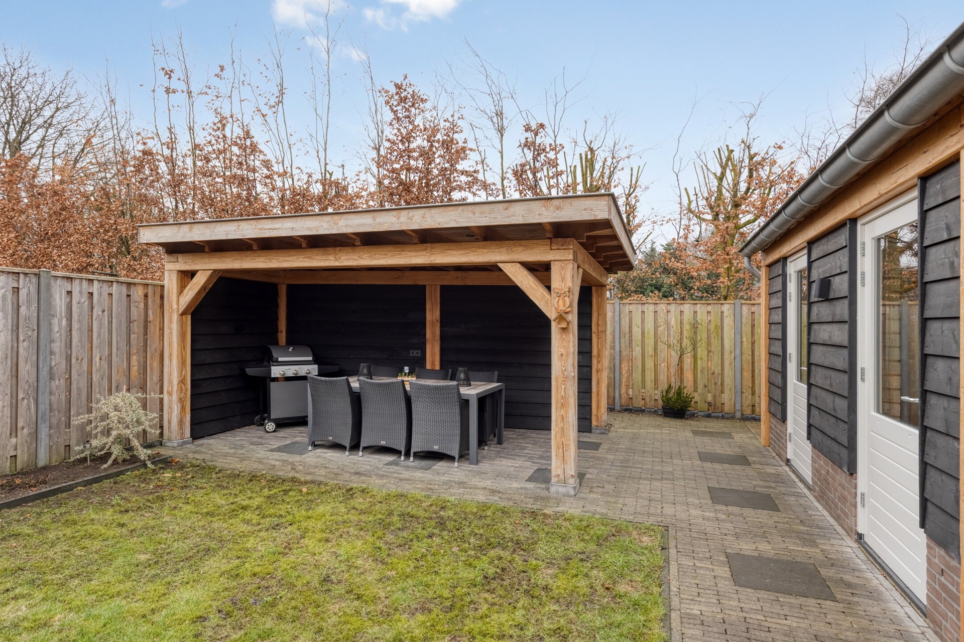 De zonnige achtertuin, gelegen op zuidoost, is sfeervol en strak aangelegd met een grote grasmat, borders en achterin een royale overkapping — een heerlijke plek om te ontspannen of te genieten van lange zomeravonden.