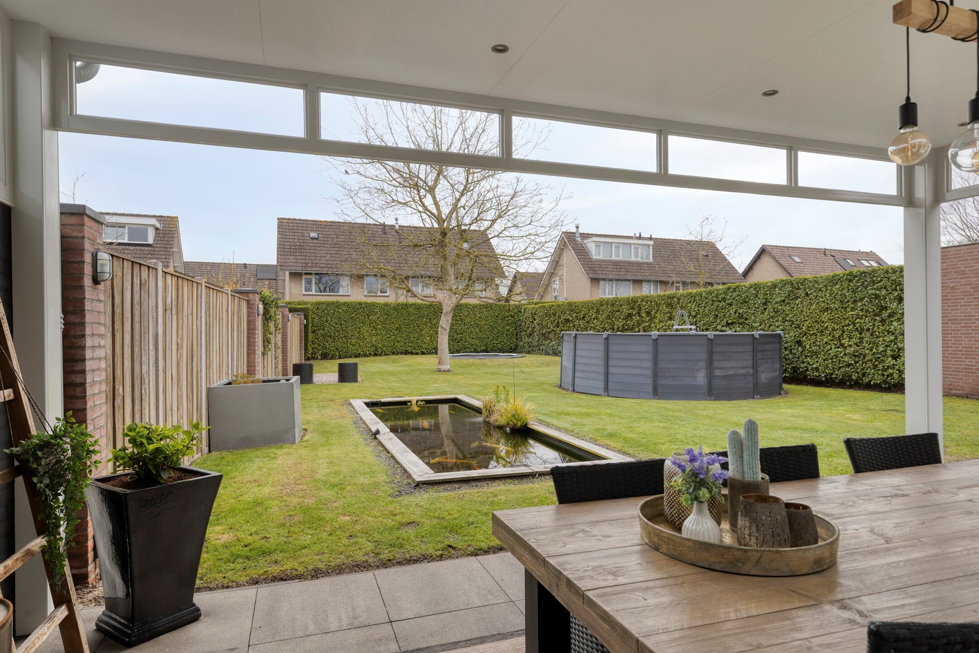 De fraai aangelegde achtertuin op het zuidoosten biedt volop privacy en zon. De tuin is ingericht met een grote grasmat, een koi-vijver, een opbouwzwembad en een ingegraven trampoline — ideaal voor zowel ontspanning als plezier met het gezin.