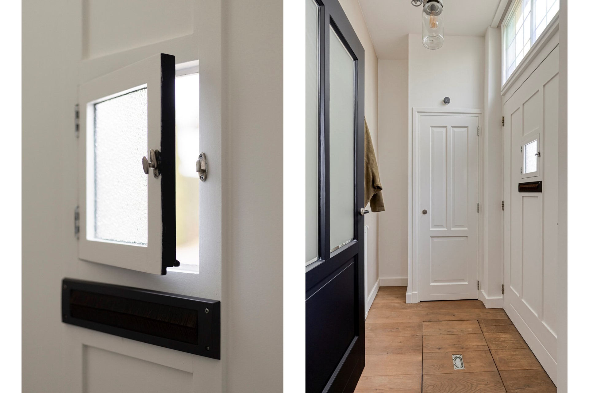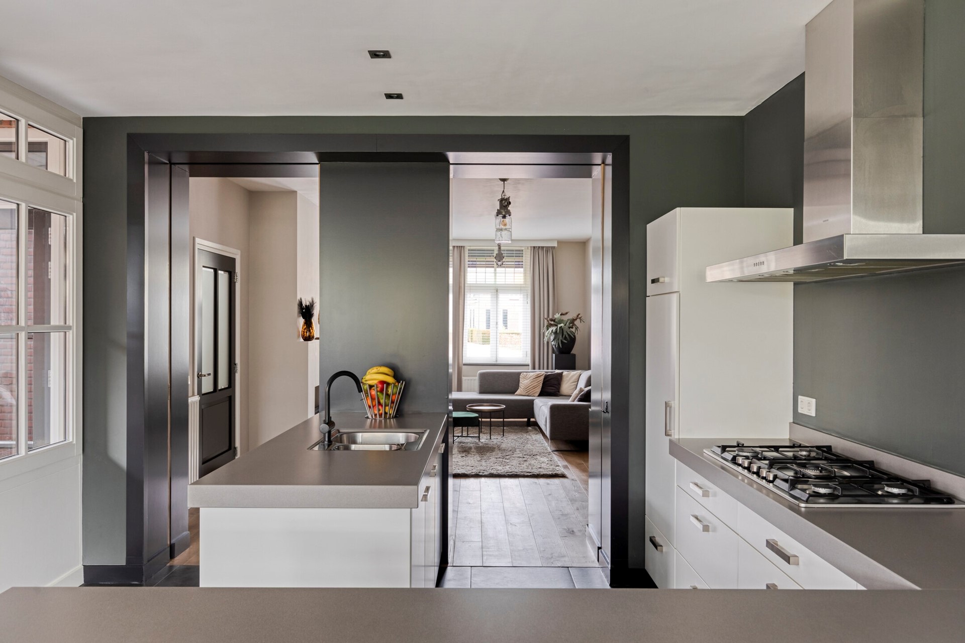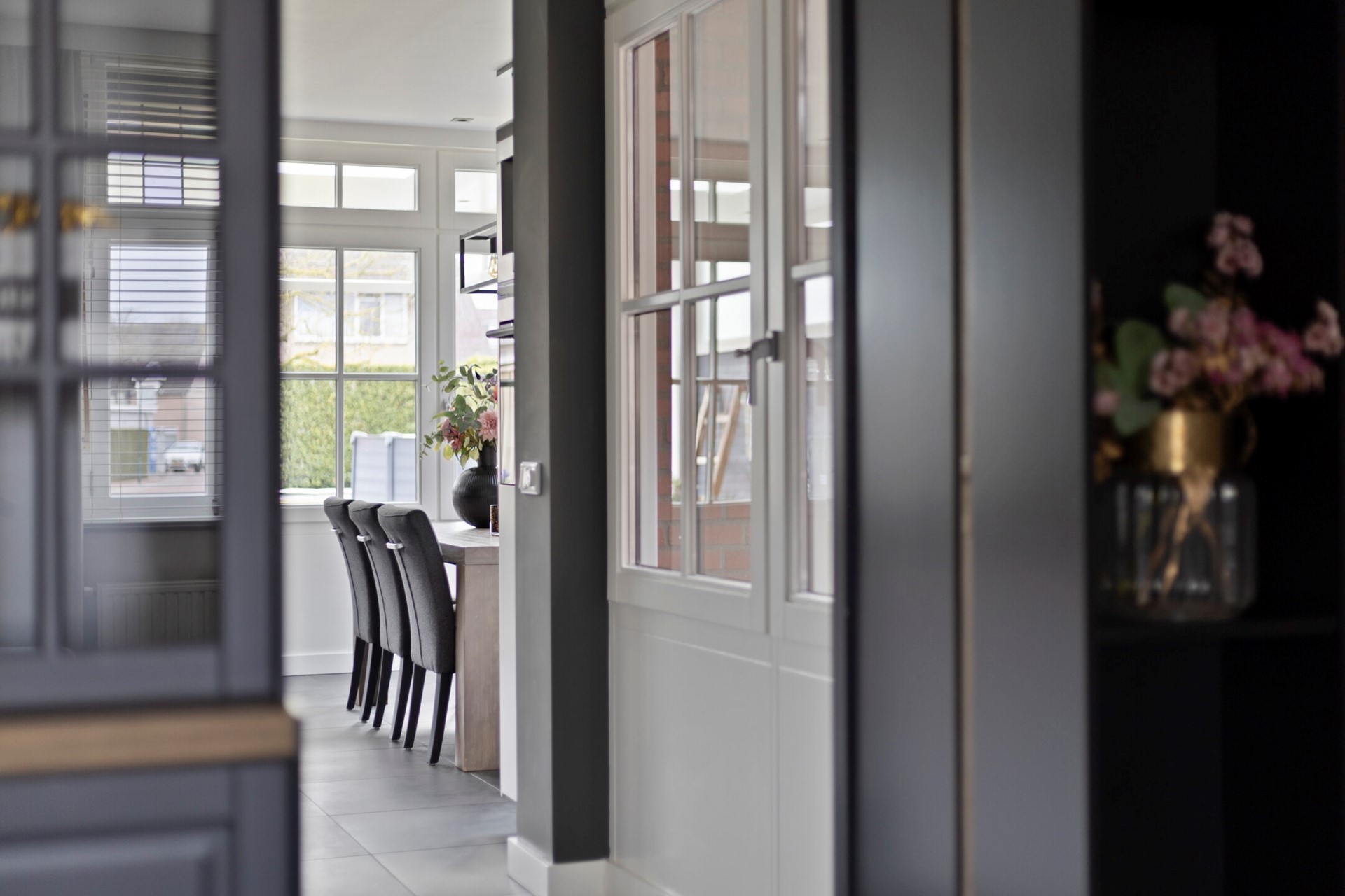 De woonkamer en keuken worden stijlvol van elkaar gescheiden door maatwerk kasten met schuifdeuren, waardoor u de ruimtes zowel open als afgesloten kunt gebruiken.