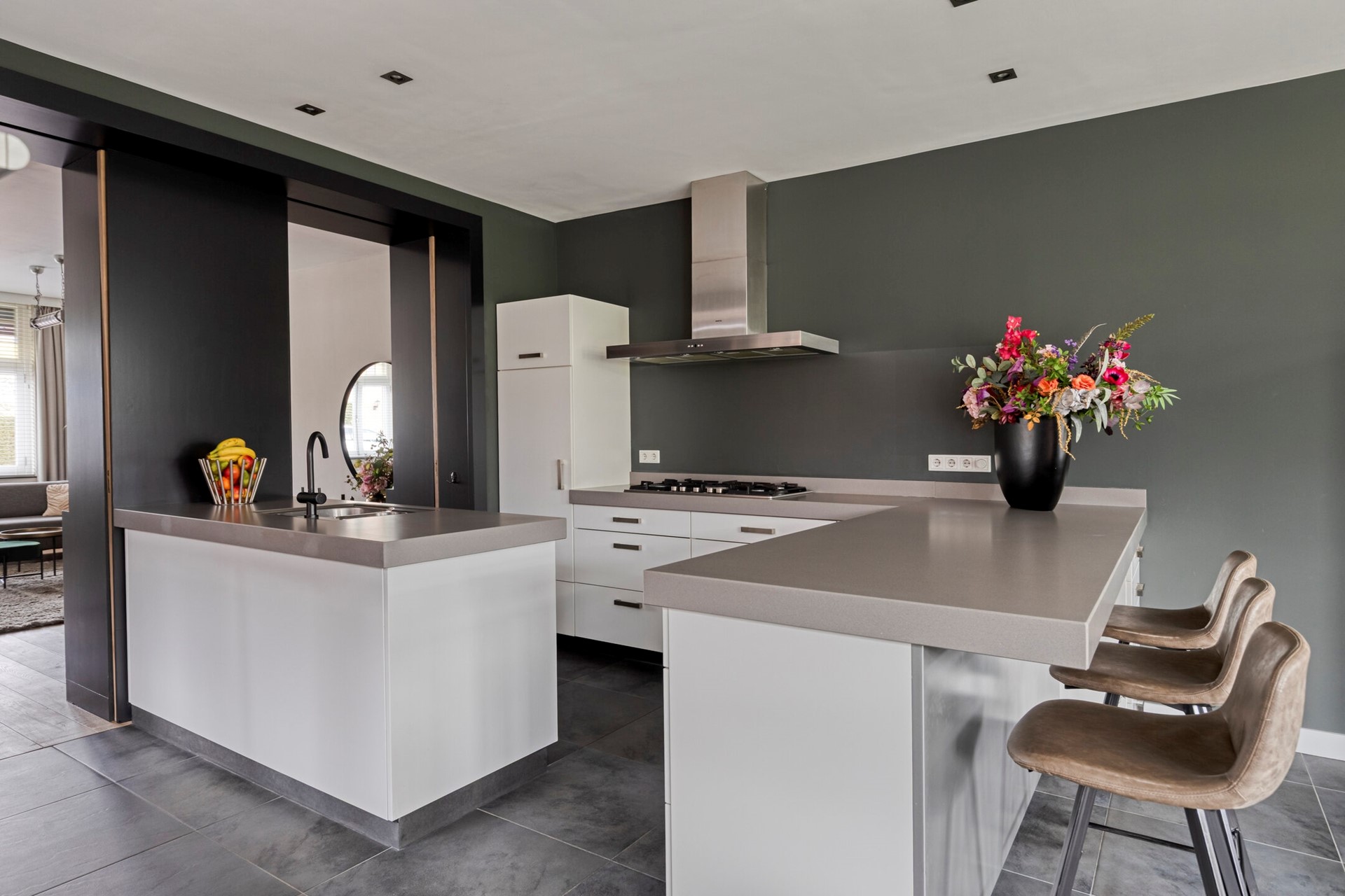 Aan de achterzijde bevindt zich de royale woonkeuken in hoekopstelling met spoelschiereiland en een losse kastenwand. De keuken is van alle gemakken voorzien, waaronder een 5-pits gasfornuis, vaatwasser, koelkast, vriezer, combi-oven en een ingebouwd koffiezetapparaat. Dankzij de grote glaspartijen en directe verbinding met de veranda en tuin ervaart u hier een prachtig binnen-buitengevoel.