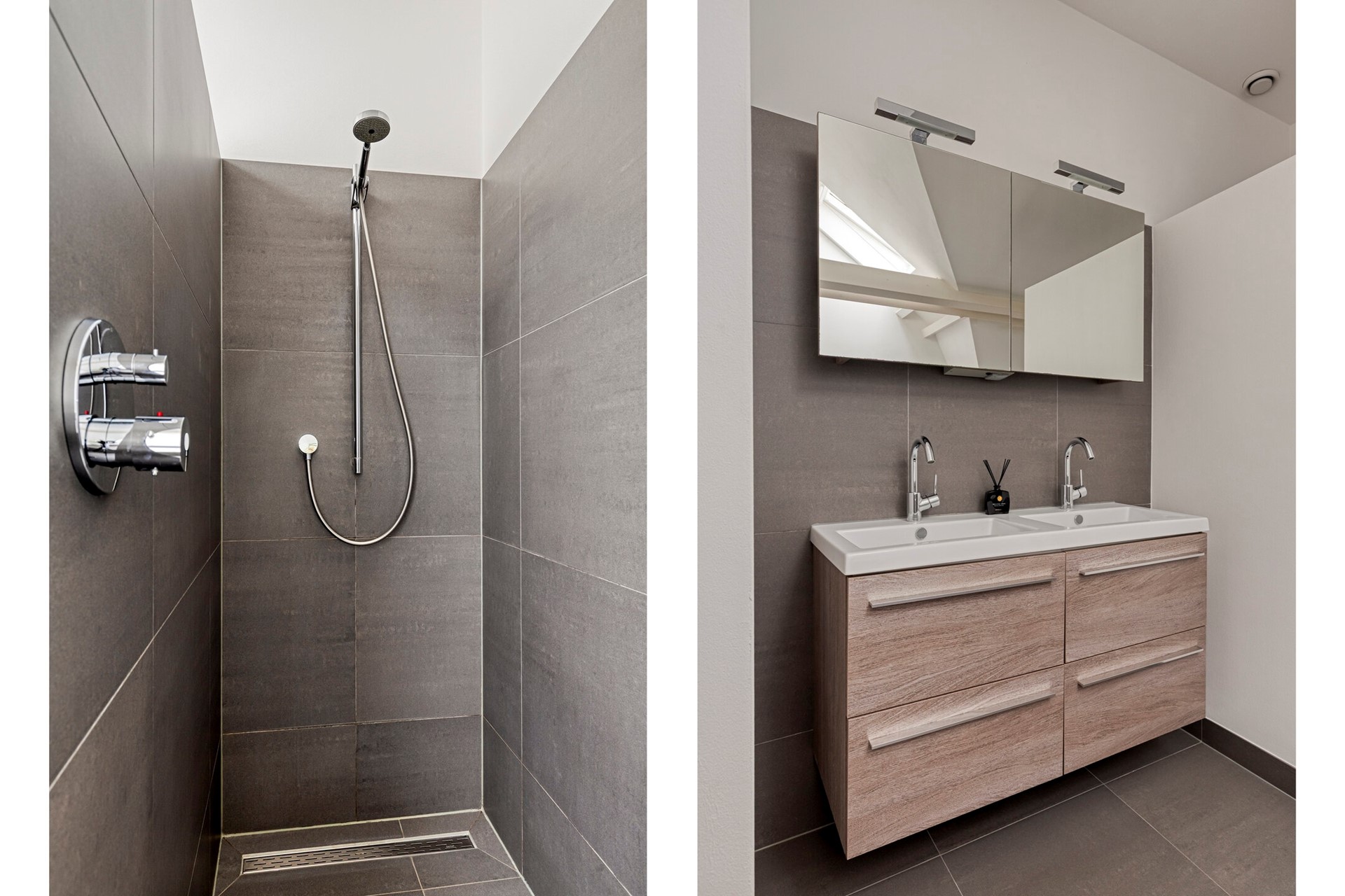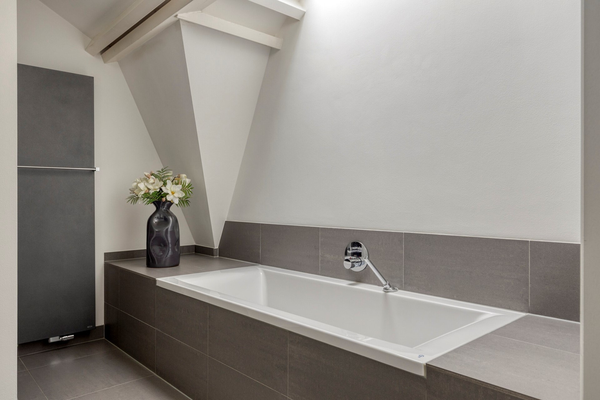 De moderne badkamer is compleet uitgerust met een ligbad, inloopdouche, dubbele wastafel en vloerverwarming. Daarnaast is er een separate toiletruimte en een praktische bergkast met de cv-installatie (Nefit, 2010). Via een vlizoluik bereikt u de bergzolder.