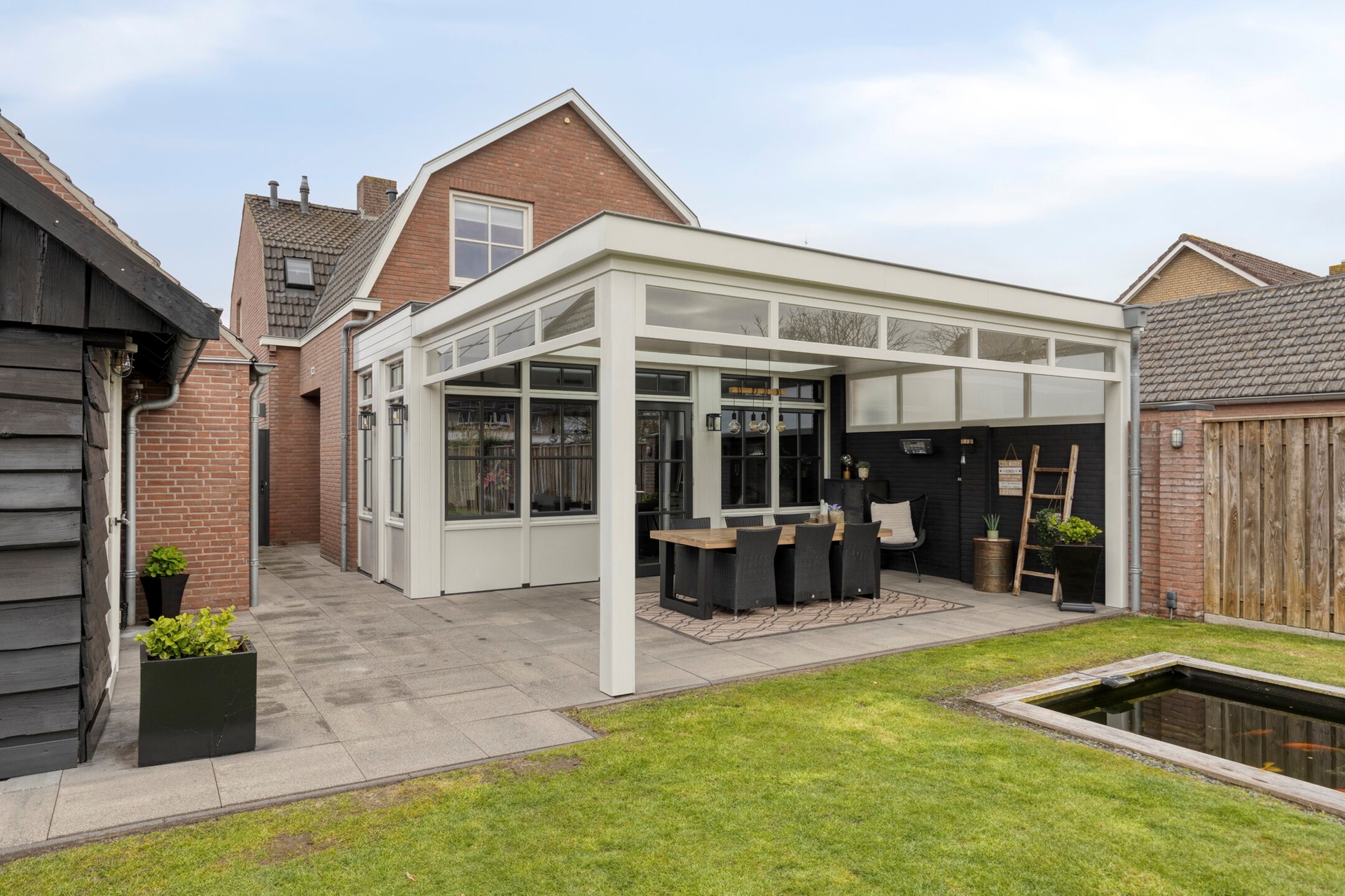 De ruime veranda aan de achterzijde van de woning (ca. 25 m²) vormt een verlengstuk van de woonruimte en maakt het mogelijk om vrijwel het hele jaar door buiten te genieten.